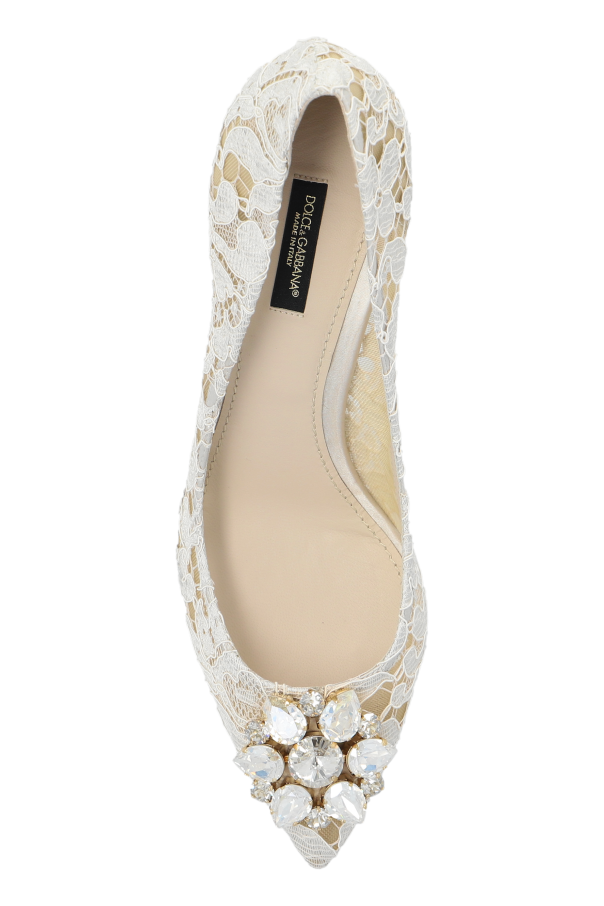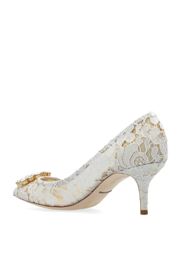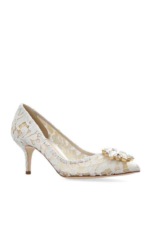 Introducing the exquisite \"Belluccii\" Heels from the exclusive collection by Dolce & Gabbana, a paragon of elegance and refined style. These heels feature a classic, tapered shape with open toes, striking the perfect balance between style and comfortable wearability. The slender, medium-height heel enhances its sleek silhouette, ensuring poise with every step. Crafted from luxurious lace material in a creamy hue, these heels exude a delicate and feminine charm. The intricate floral lace patterns add a subtle yet distinct touch of sophistication. Adorning the front, above the toes, is a dazzling embellishment of large, shiny stones and pearls, capturing attention and adding a layer of exclusivity to the design. The interior boasts a black insole marked with the brand\'s logo in white, affirming the authenticity of these distinguished heels. The dominant creamy color renders the \"Belluccii\" heels versatile and effortlessly adaptable to a myriad of stylings, making them a quintessential addition to any discerning wardrobe. Why purchase this product? Elegance and Comfort: A sleek design that does not compromise on comfort, ideal for prolonged wear. Exclusive Design: The intricate lace pattern and opulent embellishments set these heels apart as a symbol of luxury. Versatility: The creamy hue ensures these heels can be paired with an extensive range of outfits, enhancing their utility. Authenticity: Branded insole as a testament to the Dolce & Gabbana legacy of quality and luxury.