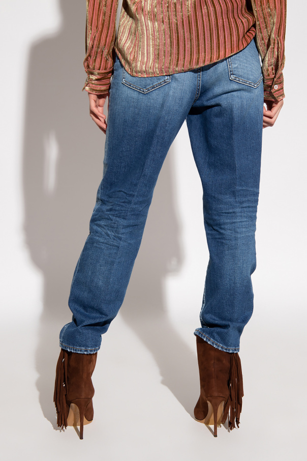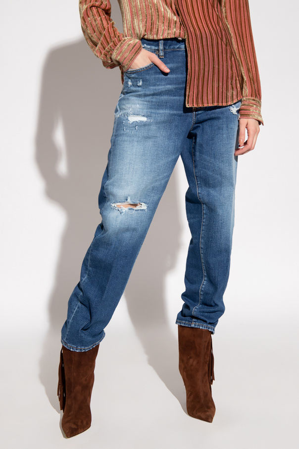 Blue ‘Boston’ jeans from Dsquared2. Made of cotton, this pair falls with tapered legs and features button fastenings, a distressed and stonewashed treatment, classic five pockets and a pink, red and white logo patch at the back.