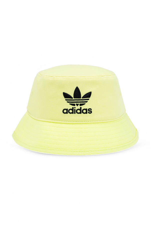 Light green bucket hat from ADIDAS Originals. Made of cotton, this item showcases an embroidered trefoil logo in black.