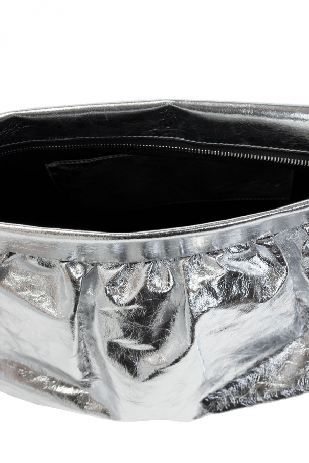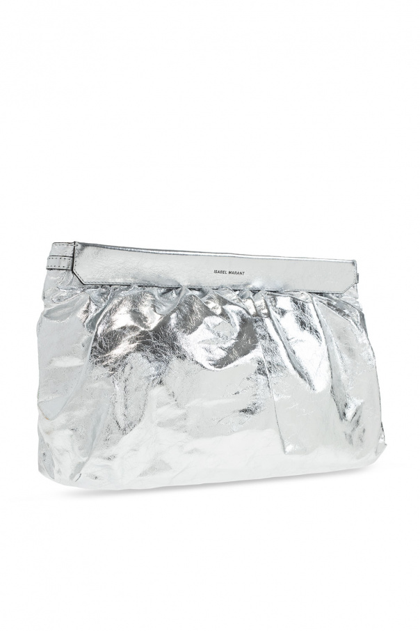 Silver-tone ‘Luz’ clutch from Isabel Marant. Made of bovine leather with a metallic finish, this design fastens via a zip and showcases a logo print, a detachable wrist strap, silver-tone metal hardware and one internal compartment with a slip pocket.