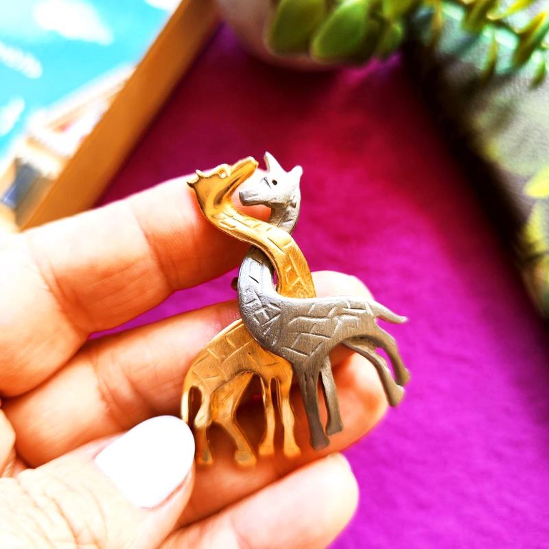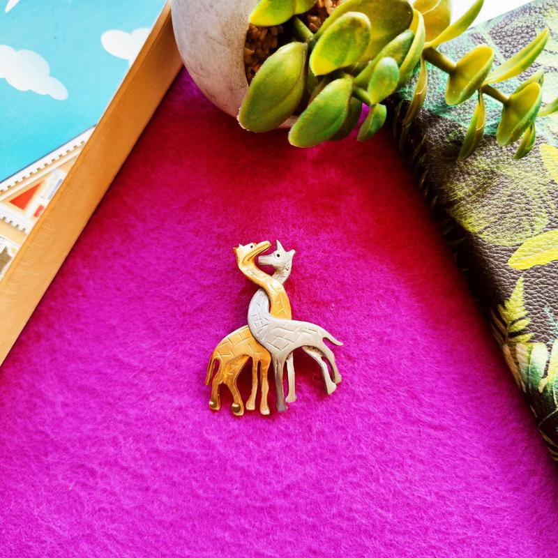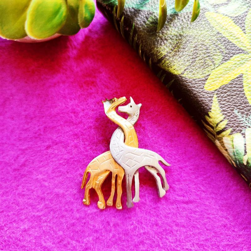 Данная брошь создана в виде двух жирафов. Основа украшения - два сплава - золотистый и серебристый на базе олова. Брошь в хорошем состоянии. Лицевая сторона в прекрасной форме. Изнаночная сторона имеет незначительные следы времени.