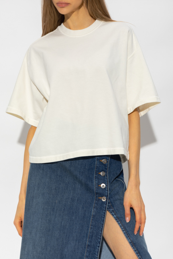 Cream crewneck T-shirt from Bottega Veneta. Made of cotton, this style features a relaxed fit, short sleeves and an elasticated collar.