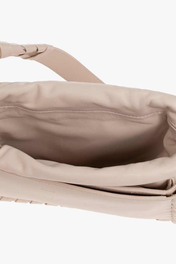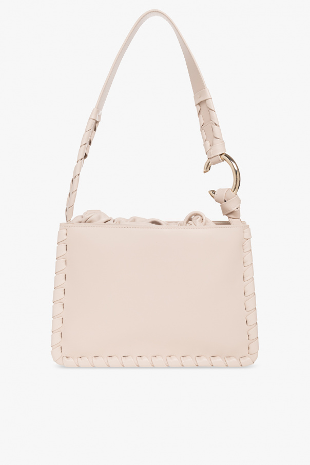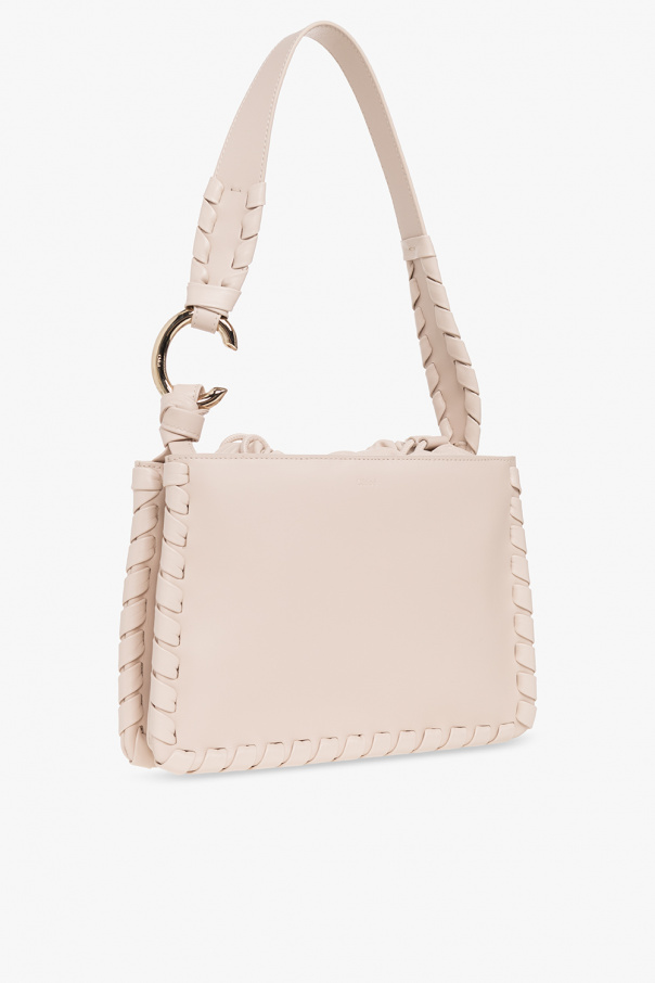 Light beige ‘Mate Small’ shoulder bag from Chloé. Crafted from calf leather, this design cinches closed with drawstrings on the sides and features distinctive braided detailing, an embossed logo on the front, one internal compartment and a shoulder strap accentuated with a gold-tone metal plaque.