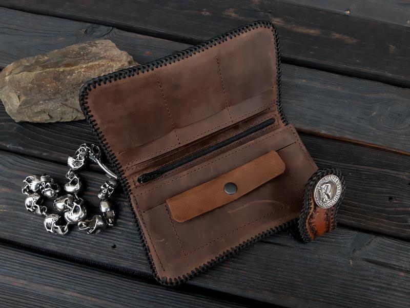 Качественная вещь для повседневного использования. Кошелек изготовлен из коричневой натуральной кожи итальянского происхождения. Украшен серебряным кончо. Ручное тиснение и роспись акрилловыми красками. Есть 15 слотов для карточек, 2 боковых кармана для купюр, один карман для документов, отделение для монет и большое отделение на молнии, в котором карманы с обеих сторон портмоне. Очень вместительный. Размер в сложенном виде: длина 20 см, ширина 10 см, толщина 2,5 см. Цвет на фотографии может немного отличаться от цвета готового изделия. Напишите нам, если у вас есть какие-либо вопросы!