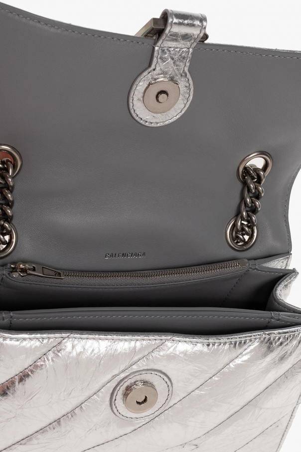 Silver-tone ‘Crush Small’ quilted shoulder bag from Balenciaga. Made of textured calf leather with a vintage and crinkle effect, this model is complete with a snap closure, logo appliqué, double shoulder strap, silver-tone metal hardware and two separate internal compartments with one zip pocket and two slip pockets.