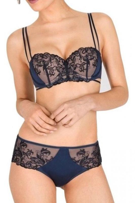 Бюстгальтер модельной линии< Luxe Collection от бренда Wonderbra с изысканной вышивкой в аристократическом стиле. Плотные чашки телесного цвета со встроенным пуш-ап, на косточках, декорированные кружевным вышитым черным тюлем. Открытое декольте, двойные узкие бретели, спинка из плотного тюля, декоративная отделка эластичной лентой по бокам и на спинке.