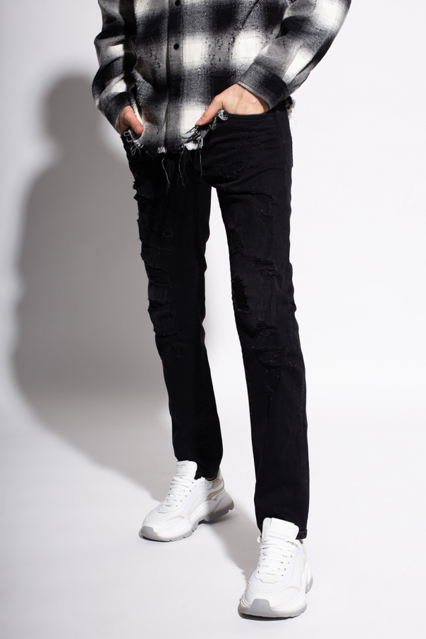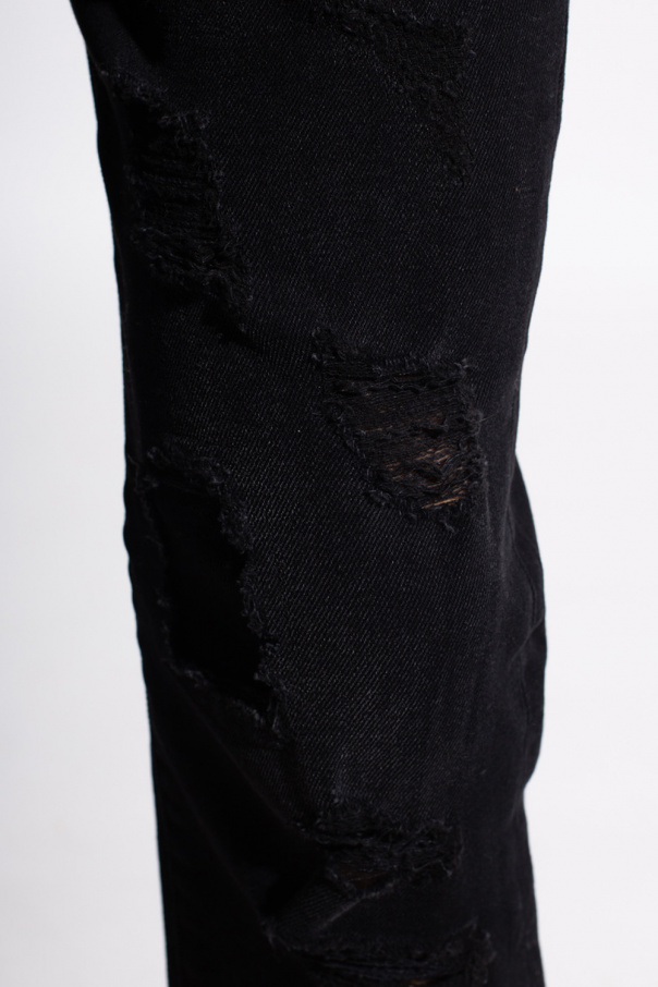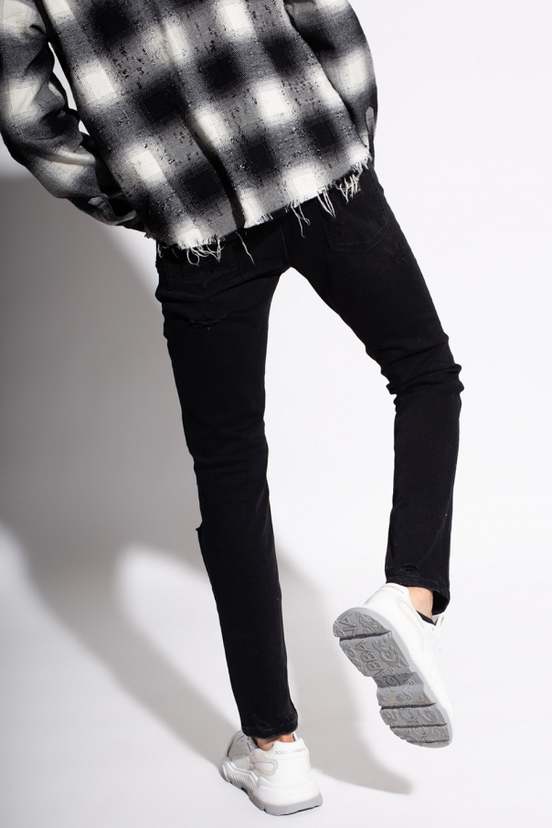 Black distressed jeans from Dolce & Gabbana. Fastened with a zip and button, this tapered leg design features two front pockets, two back pockets and a raw cut edge.