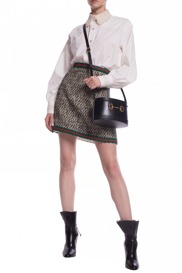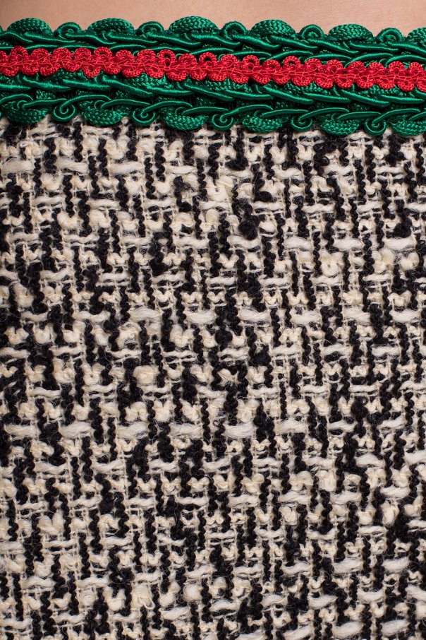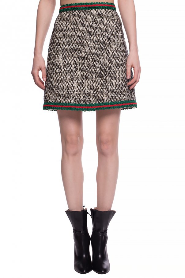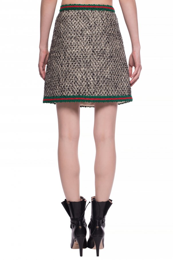 Black and white tweed skirt from Gucci. Zip and hook fastening on the side. Waist decorated with a woven ‘Web’ stripe in green, red and green.