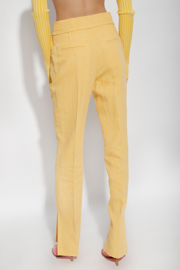 Yellow ‘Tibau’ pleat-front trousers from Jacquemus. Crafted from a linen blend, this pair falls with straight legs and features a zip fly with a button and hooks, four slip pockets, slits and side panels.