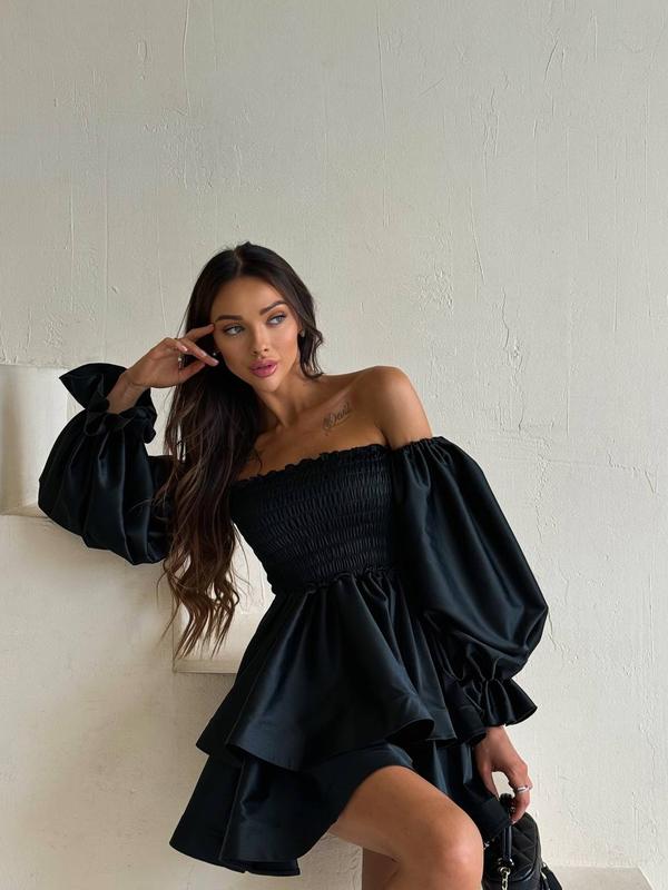 Зроблено в Україні?:Виробництво ,Матеріал:Атлас , Атлас ,Особливості моделі:На резинці ,Довжина рукава:Довгий ,Особливості:Коктейльне ,Сезон:Зима , Осінь , Весна , Демісезон ,Принт:Без принту ,Довжина:Міні ,Стиль:Вечірній , Романтичний , Святковий , - Shipping