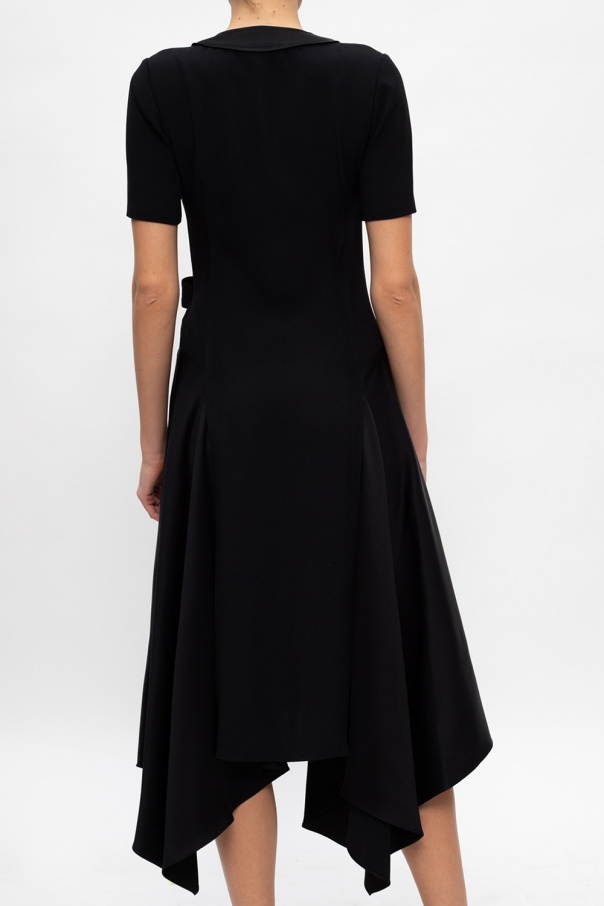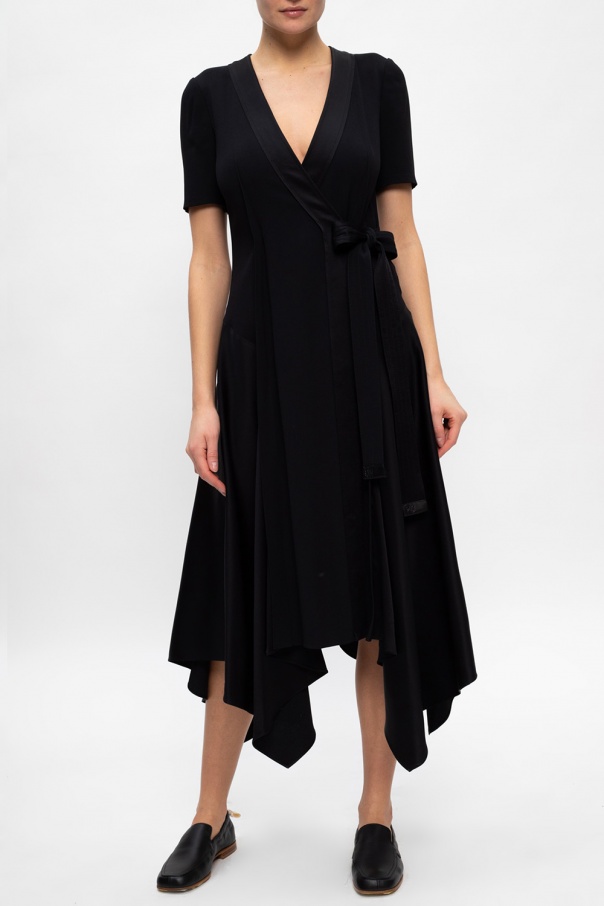Black dress from Loewe. Falling down to a flared skirt, this short-sleeved style features an asymmetric hem, gathered details and a wrapped waist.