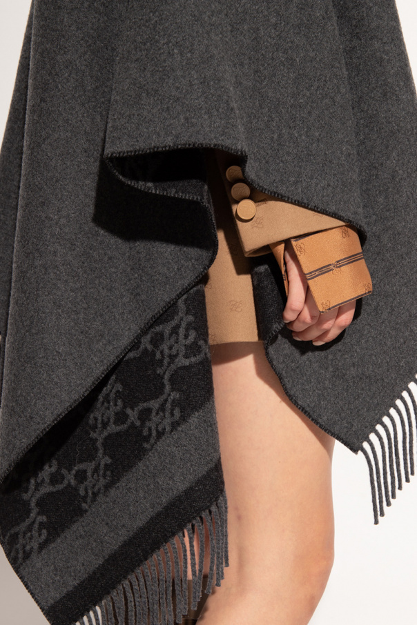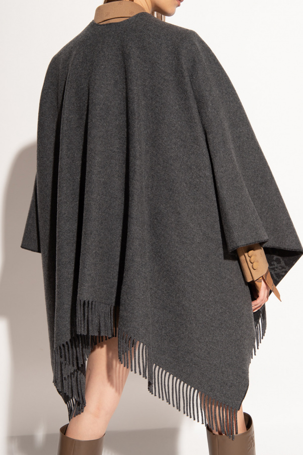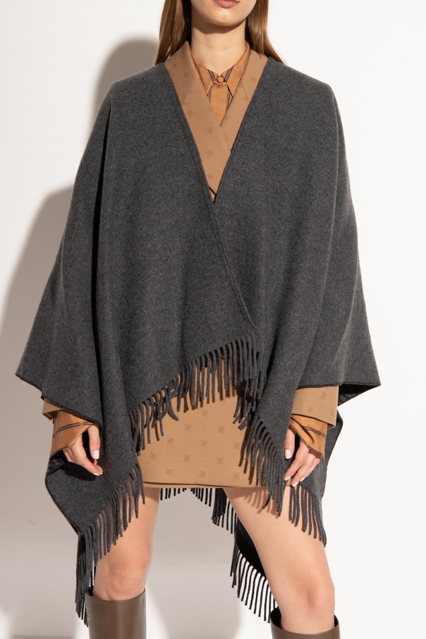 Reversible poncho from Fendi. Crafted from a wool and cashmere blend, this style showcases fringe detailing and reverses between a grey side and a dark grey side accentuated with a logo pattern.