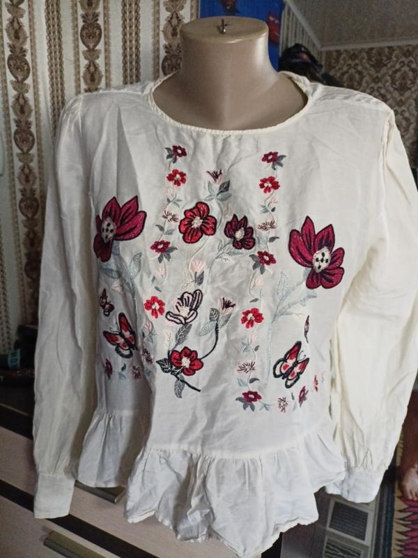Очень красивая блуза молочного цвета с вышивкой ткань натуральная батист. зал застежка на пуговицы. объем груди 100 см. длина 48 см. рукав 57 см.