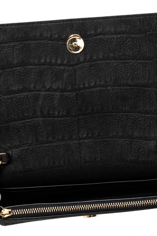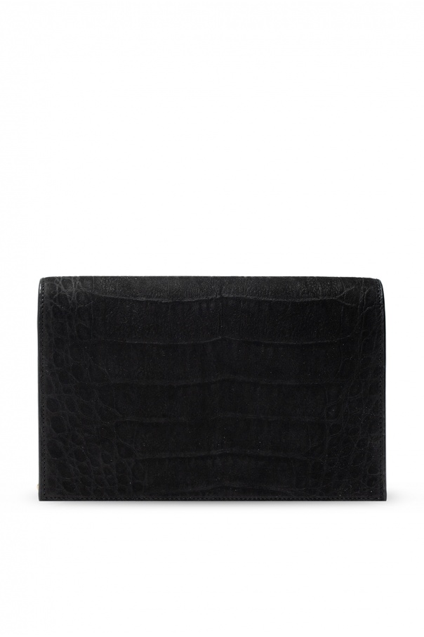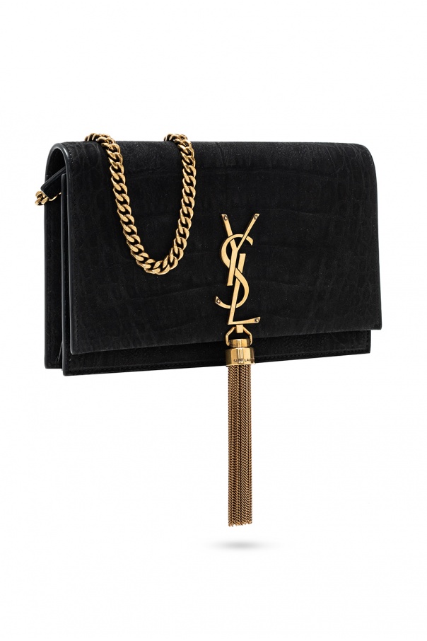 Black ‘Kate’ wallet from Saint Laurent. Crafted from bovine leather, this item features a magnetic snap closure, metal logo detail, tassel pendant, detachable chain strap with leather trims and antiqued gold-tone metal hardware. The interior is lined with black fabric and includes one bill compartment, one zip pocket and six card slots.