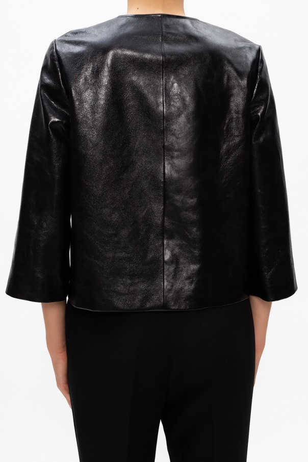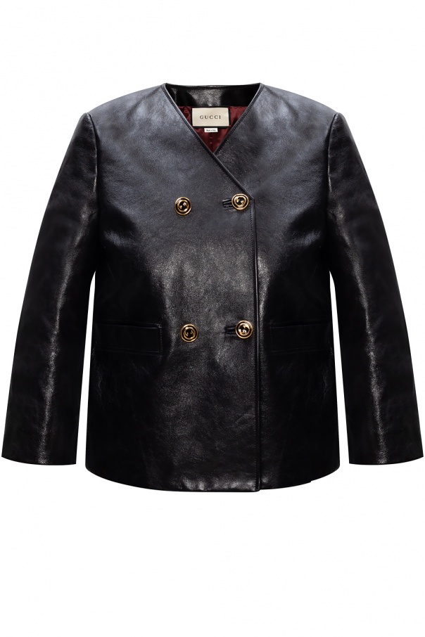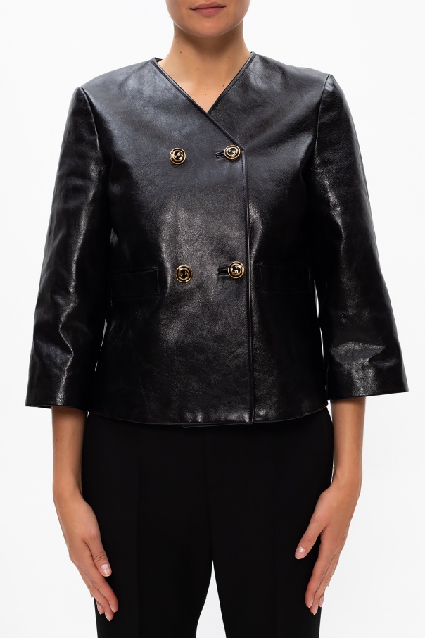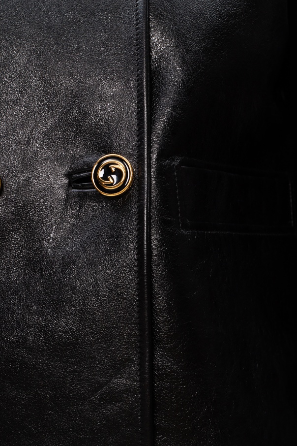 Black jacket from Gucci. Crafted from lamb leather, this style comes with two welt front pockets and gold-tone metal logo hardware.