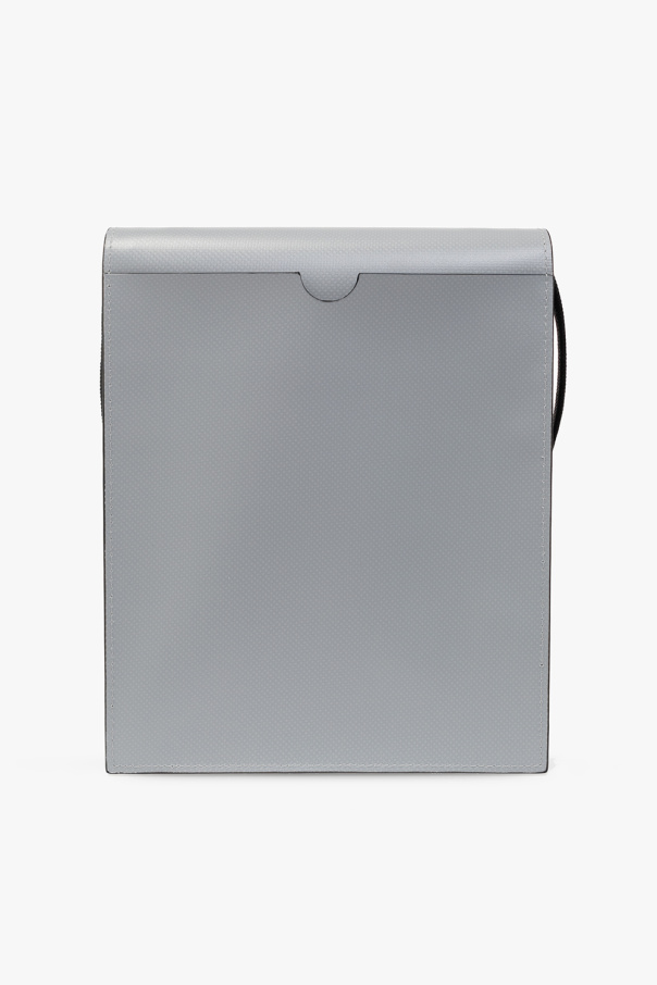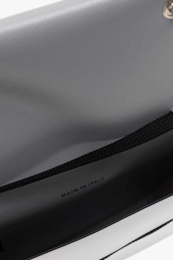 White and grey ‘Tribeca’ shoulder bag from Marni. Fastened with snaps, this design showcases a zip pocket accompanied with a black logo print on the front, one back slip pocket, an adjustable shoulder strap, silver-tone metal hardware and one internal compartment.