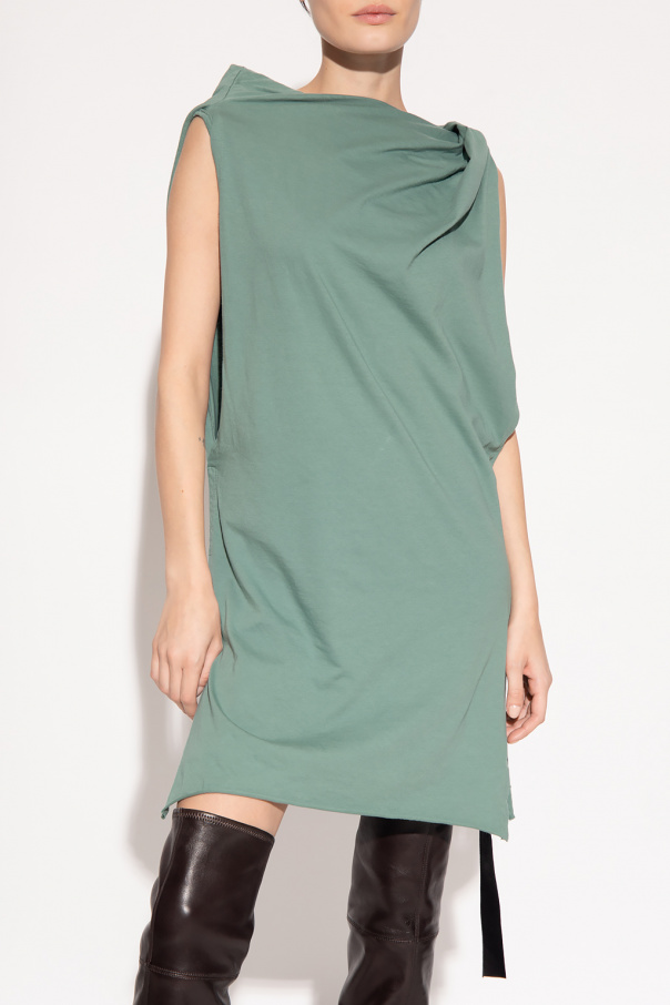 Green sleeveless dress from Rick Owens DRKSHDW. Made from cotton, this style features distinctive drape detailing, a double bottom slit and a decorative black logo appliqué for brand recognition.