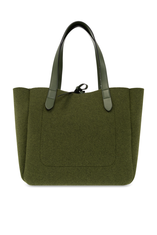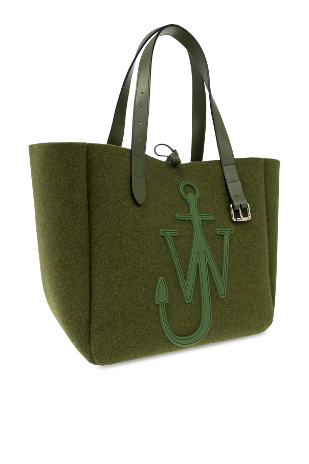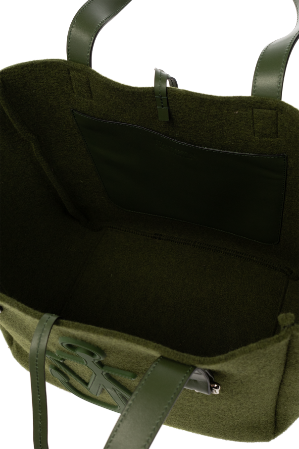 Dark green ‘Belt’ shopper bag from JW Anderson. Crafted from recycled felt and trimmed with leather, this design cinches closed with drawstrings and showcases a logo-shaped rubber patch. It is complete with a shoulder strap, two handles with buckles, silver-tone metal hardware and one internal compartment with a slip pocket.