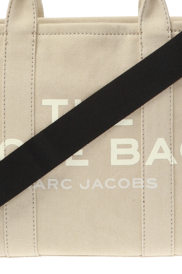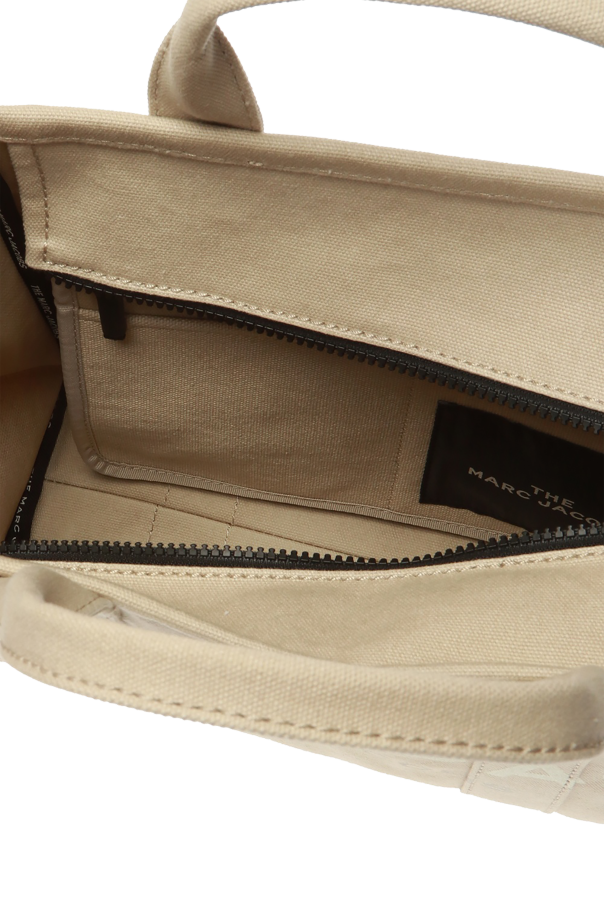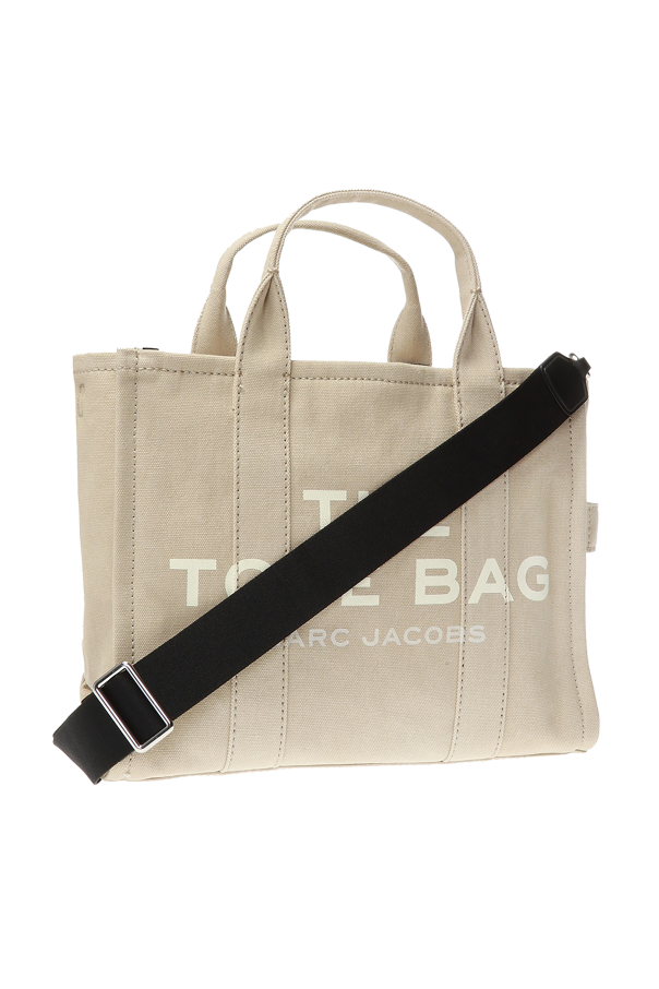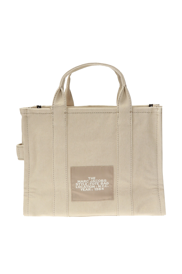 Beige \'The Medium Tote\' bag from Marc Jacobs. Made of canvas. Fastened via zip. Embellished with printed white and beige logo. Features two half-round handles, attached an adjustable shoulder strap and interior with one compartment and two slip pockets inside.