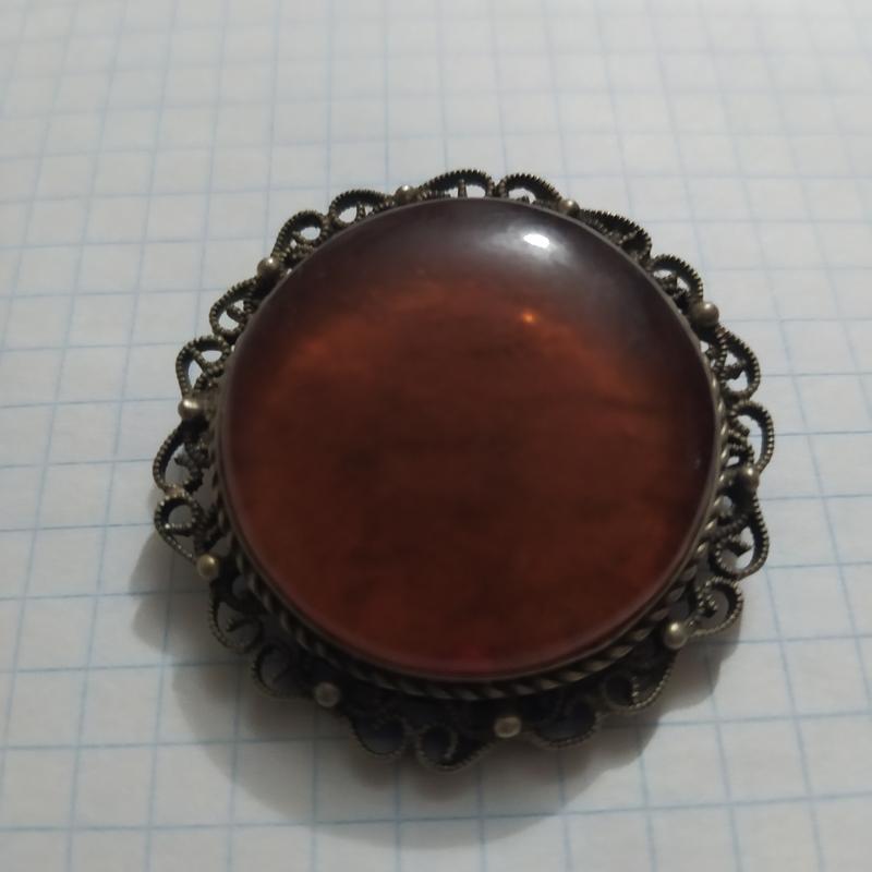 Крупная винтажная брошь с янтарем. Застежка крючок