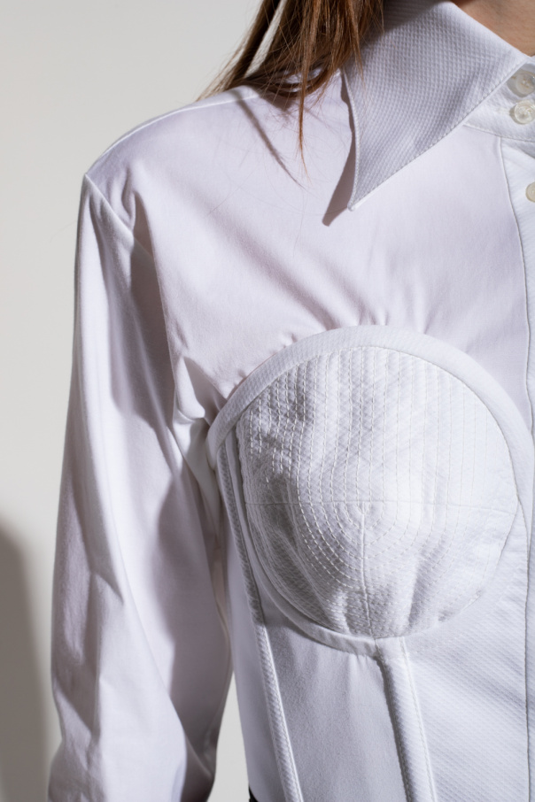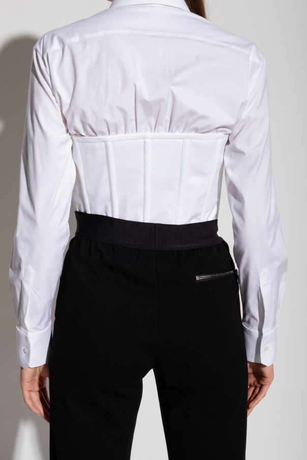 White shirt with a collar from Dolce & Gabbana, the ‘Hot Stuff’ collection. Made of cotton. Fastened with buttons, this garment features bustier details, molded cups and long sleeves with button cuffs.