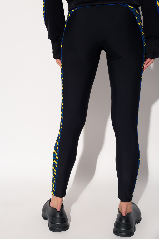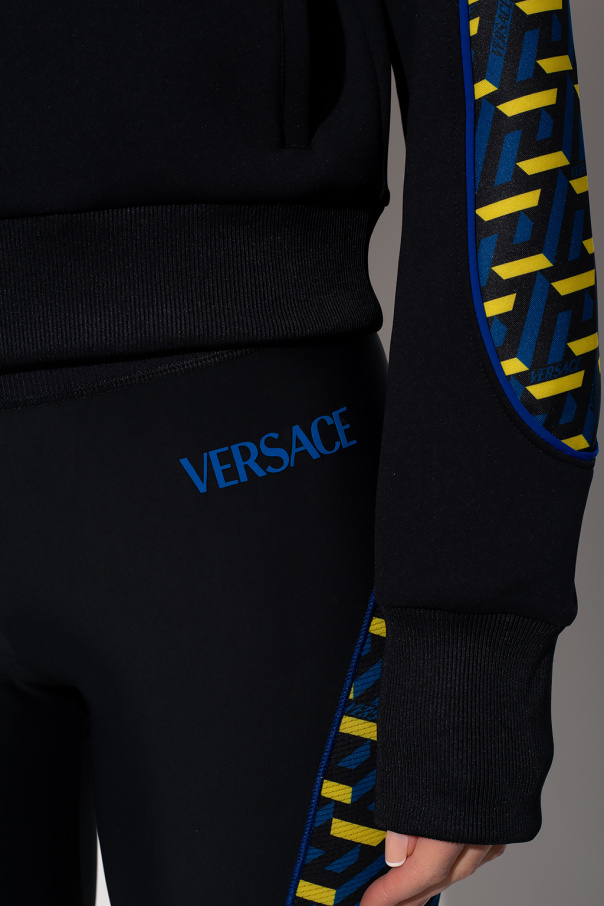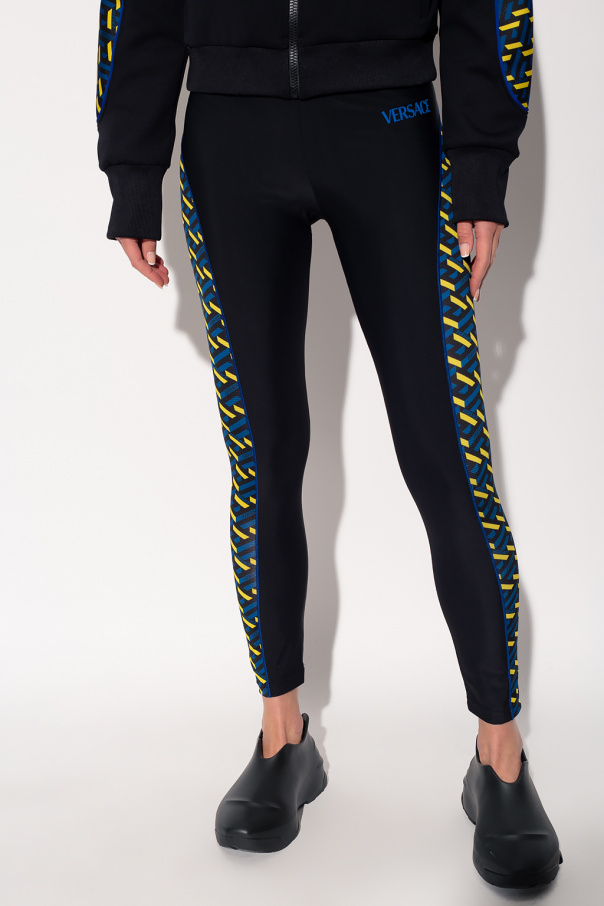 Black leggings from Versace. Embellished with a navy blue and yellow logo pattern, they feature an elasticated waistband and tapered legs.
