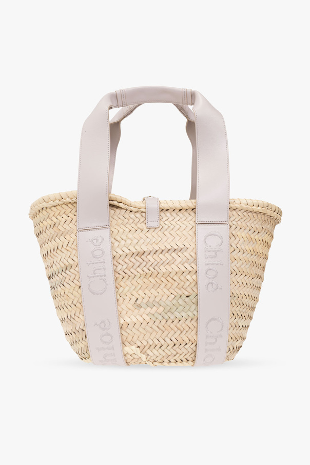 Beige and light purple ‘Chloé Sense Medium’ shopper bag from Chloé. Crafted from woven palm leaves and trimmed with calf leather, this design secures with an adjustable buckle strap and showcases an embroidered logo, two half-round straps, gold-tone metal hardware and one internal compartment.
