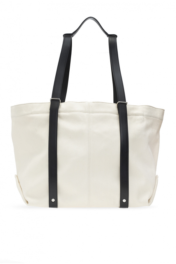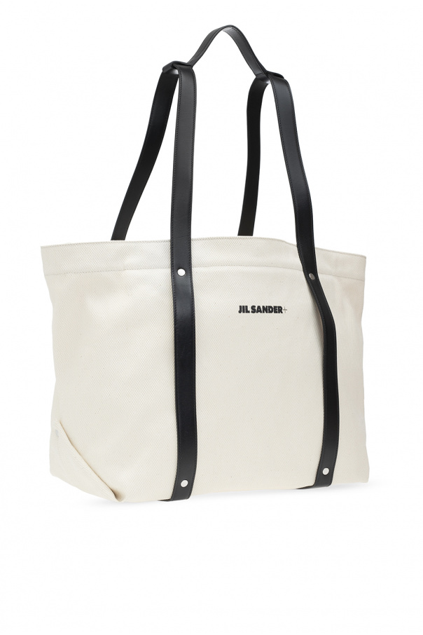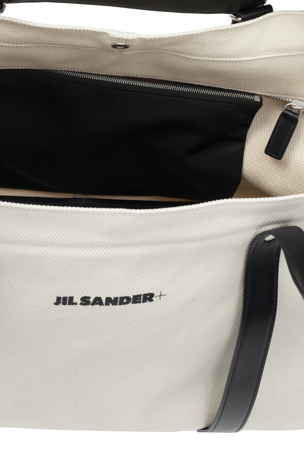 Cream and black shoulder bag from Jil Sander. Size small. Crafted from calf leather, this design features a snap and zip fastening, black logo print, two half-round handles, one internal compartment, black detachable zipped pouch and silver-tone metal hardware.