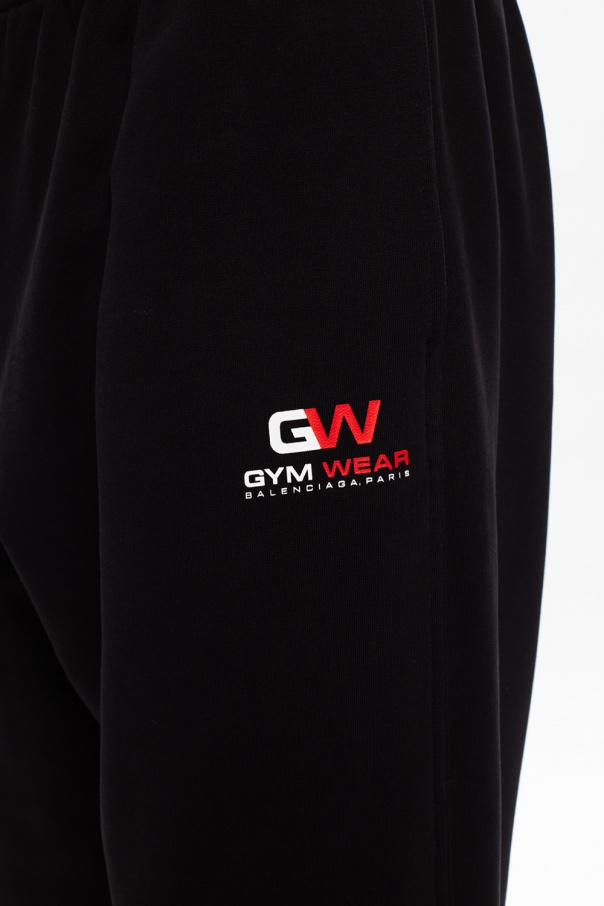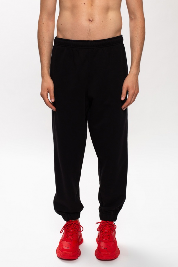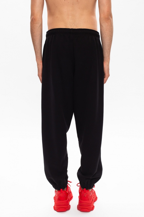 Black sweatpants from Balenciaga. This item has an elastic waistband, drawstrings, red and white logo print, two front slip pockets and ribbed cuffs.