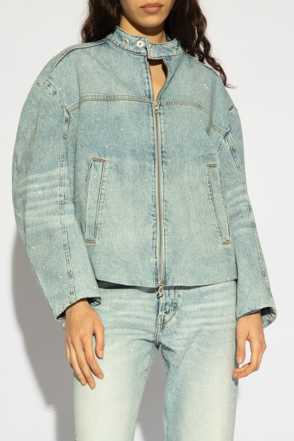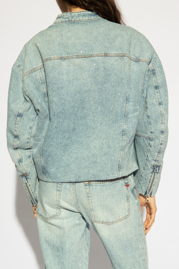 Light blue ‘DE-MARGE-FSE’ denim jacket from Diesel. Crafted with a relaxed fit, this style fastens via a two-way zip and showcases sparkling appliqués, two slip pockets, long sleeves with zip cuffs and a standing collar with a half-zip closure.