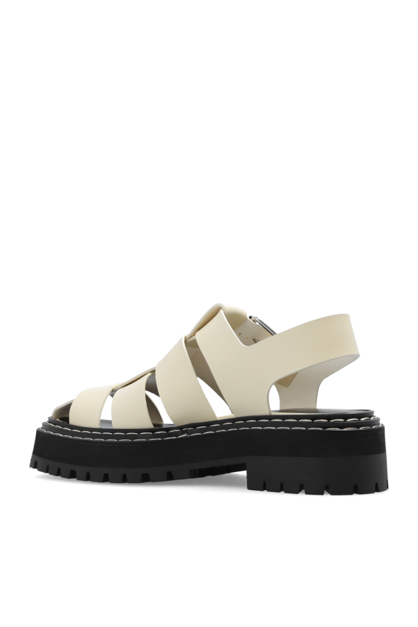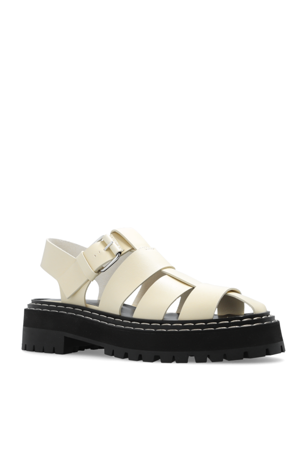 Cream ‘Fisherman’ sandals from Proenza Schouler. Made of leather, this model sits on a black rubber sole accentuated with topstitched details and features an adjustable buckle straps and decorative cutouts.