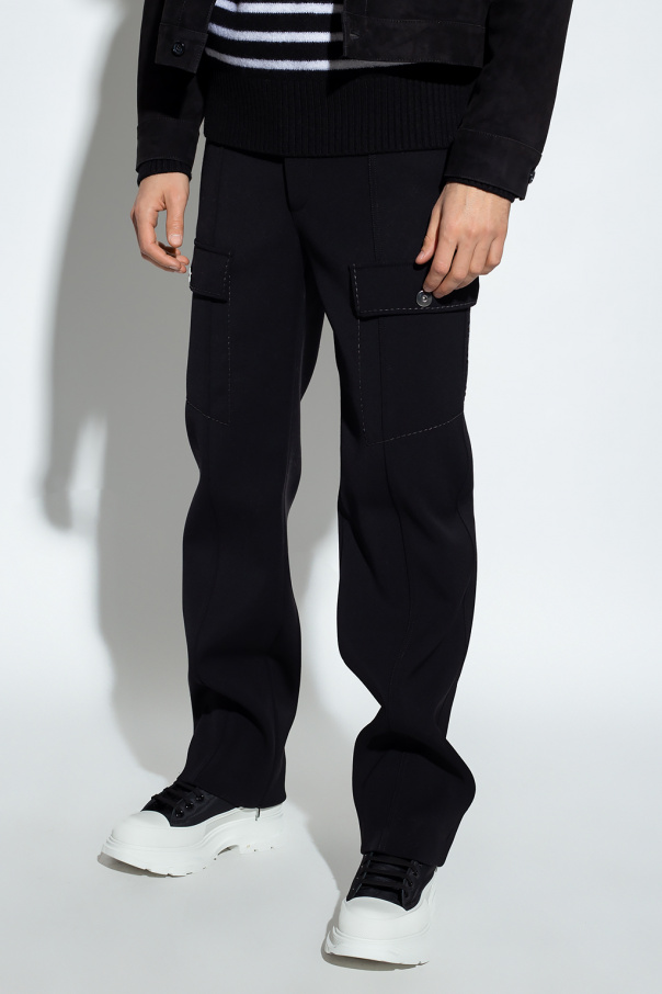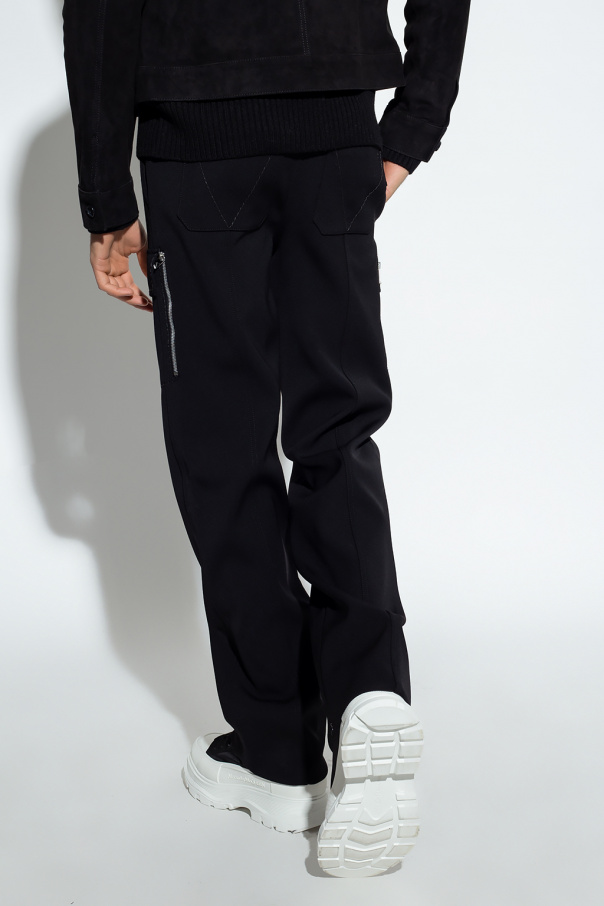 Black trousers from Bottega Veneta. Crafted from wool, this pair features a zip, hook and button closure, multiple pockets, silver-tone metal hardware and straight legs with zips.