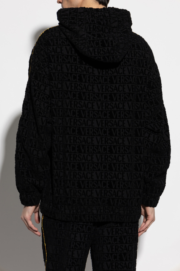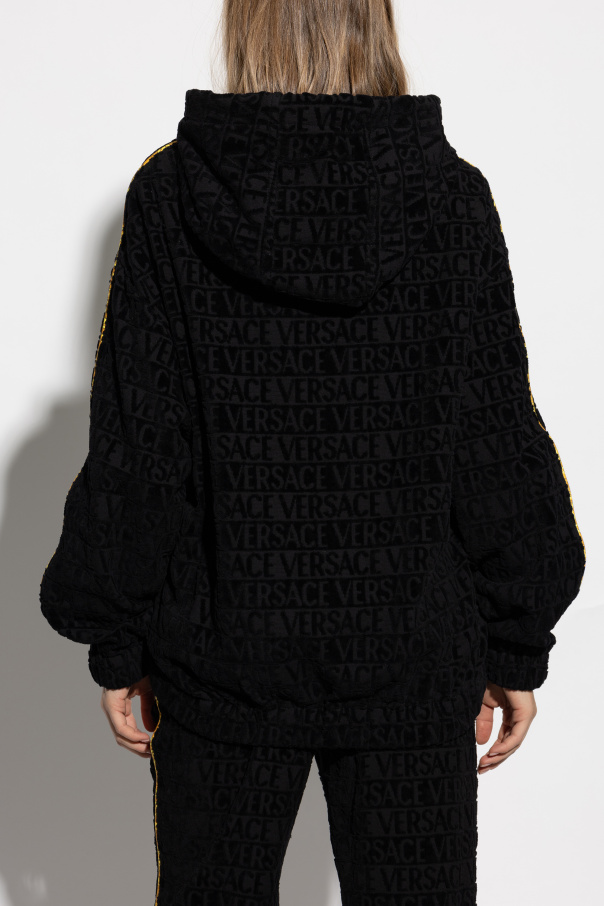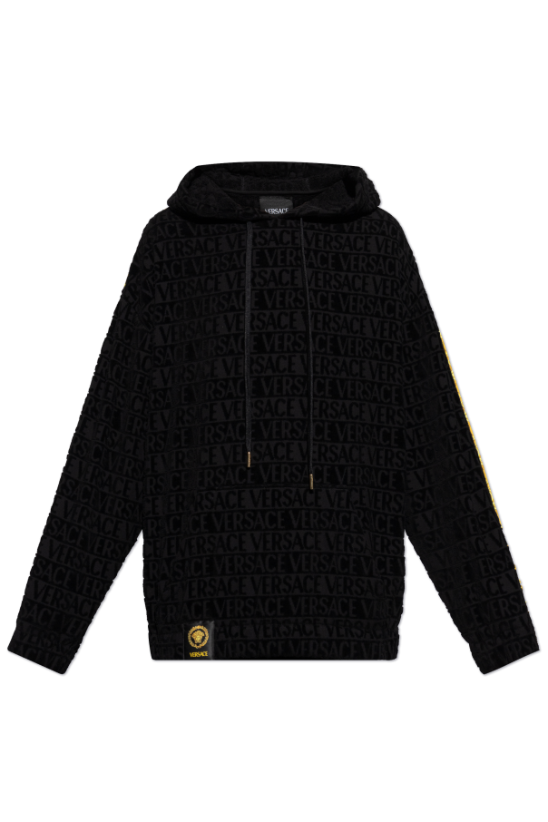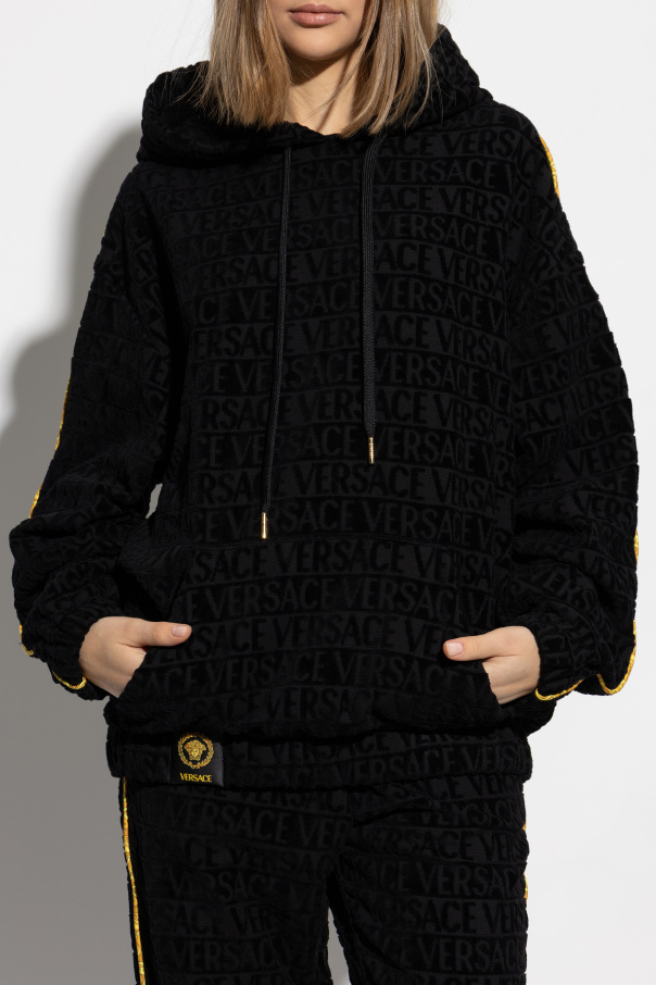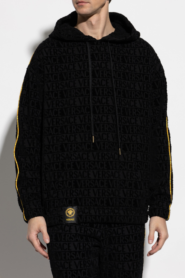 Introducing the Versace Logo Hoodie, a quintessential blend of opulence and contemporary style. Crafted from the finest black cotton, this exclusive hoodie features an embossed pattern with the iconic \"VERSACE\" inscription, epitomizing the brand\'s luxurious legacy. The hoodie boasts a relaxed silhouette with a hood and long sleeves, adorned with striking yellow stripes running down the sleeves, adding a vibrant contrast. A practical kangaroo pocket graces the front, ensuring both style and functionality. At the base, the hoodie is adorned with a Versace logo patch accentuated by gold-toned details, affirming the garment\'s premium status. Why Choose This Product? Luxurious design with iconic Versace embossing. Constructed from premium cotton for superior comfort. Distinctive yellow accents for a bold statement. Functional kangaroo pocket for convenience. Exquisite logo patch with gold details for a touch of elegance.
