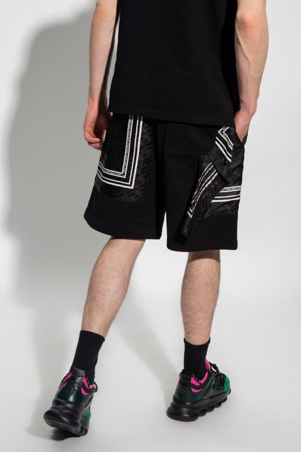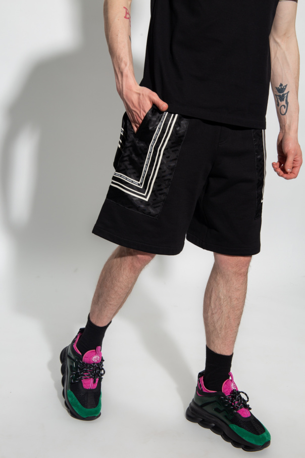 Black and white shorts from Versace. Crafted from a cotton and silk blend, this pair showcases the brand\'s logo and its signature ‘La Greca’ pattern, a drawstring waist, two pockets on the front and one at the back.
