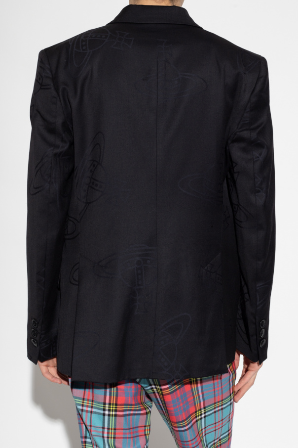 Black blazer from Vivienne Westwood. Made of virgin wool, this design features button fastenings, monogram pattern, three flap pockets, one slip pocket, double rear vent, peak lapels and long sleeves with buttoned cuffs.