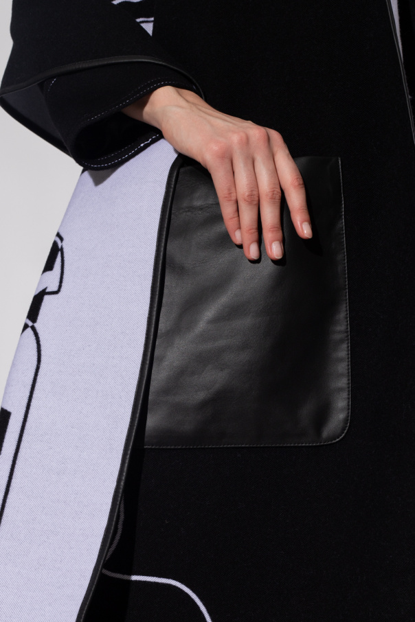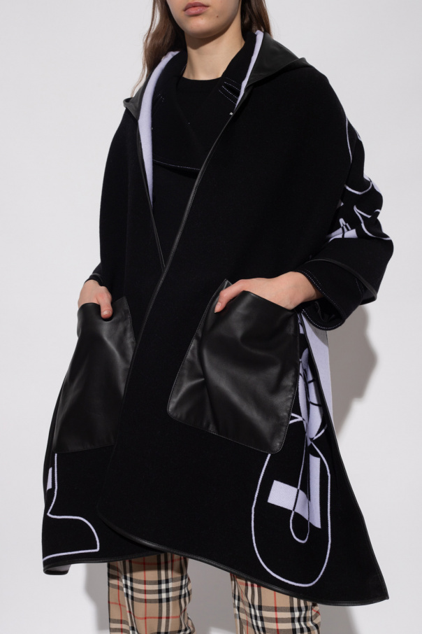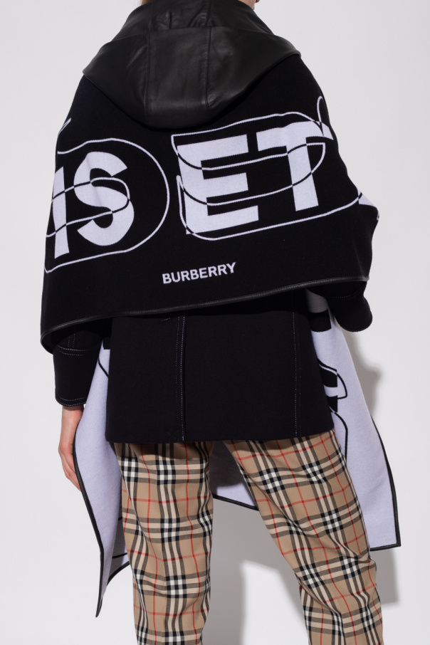 Black and white hooded poncho from Burberry. Made of a wool and cotton blend with lamb leather trims, this model features a logo pattern and two slip pockets.