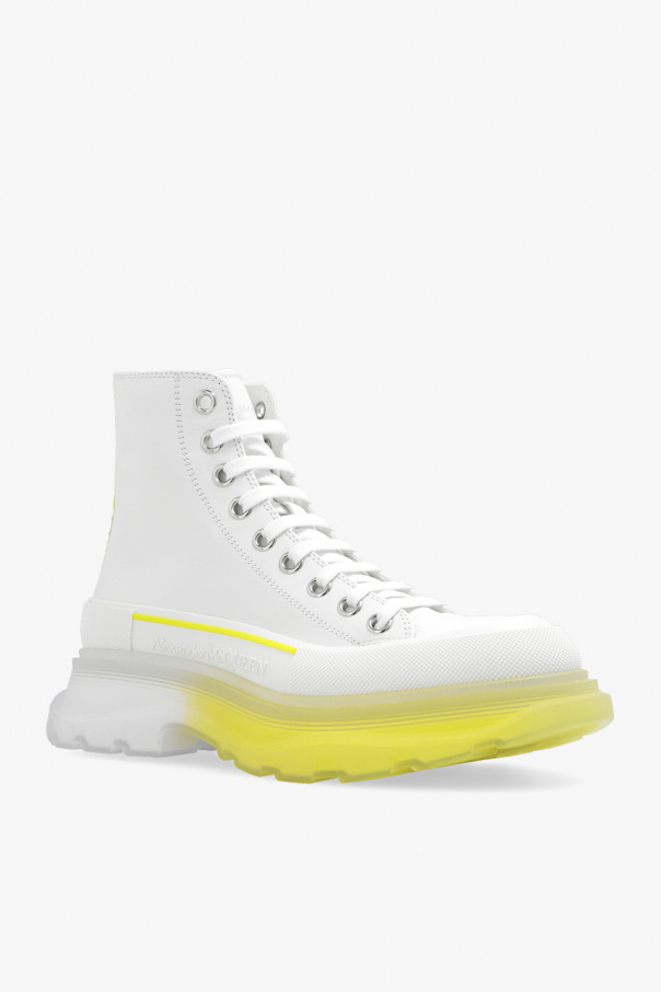 White and yellow platform sneakers from Alexander McQueen. Crafted from calf leather, this lace-up model features rubber trims, a tactile logo on the side and a semi-translucent rubber sole in white and yellow. Swappable shoelaces included.