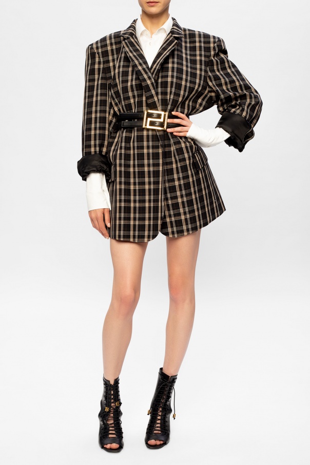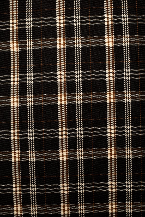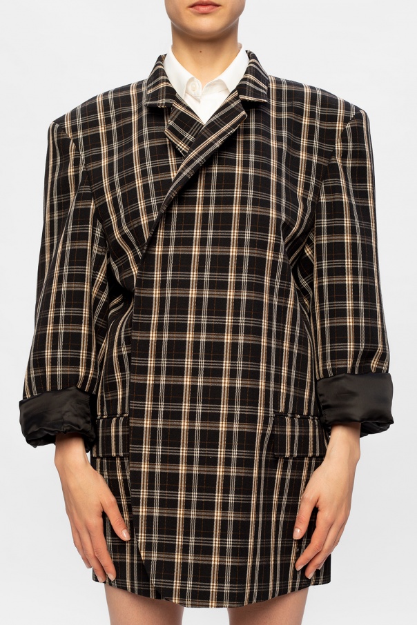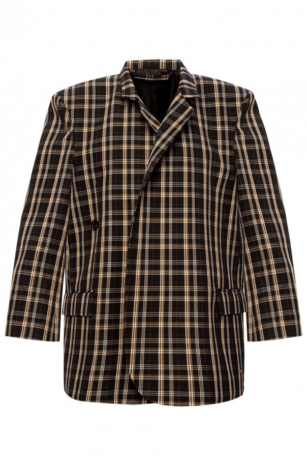 Black blazer from Balenciaga. Made of wool. Embellished with woven white and brown check pattern throughout. Features single button closing and two flap pockets on the front.