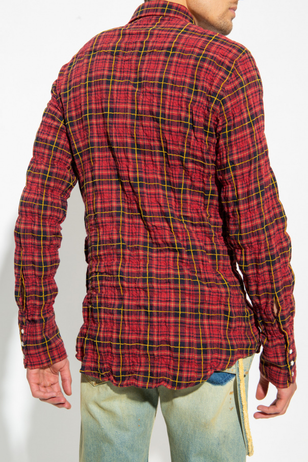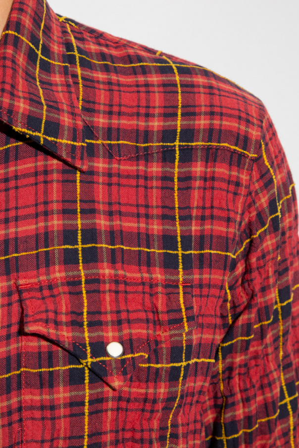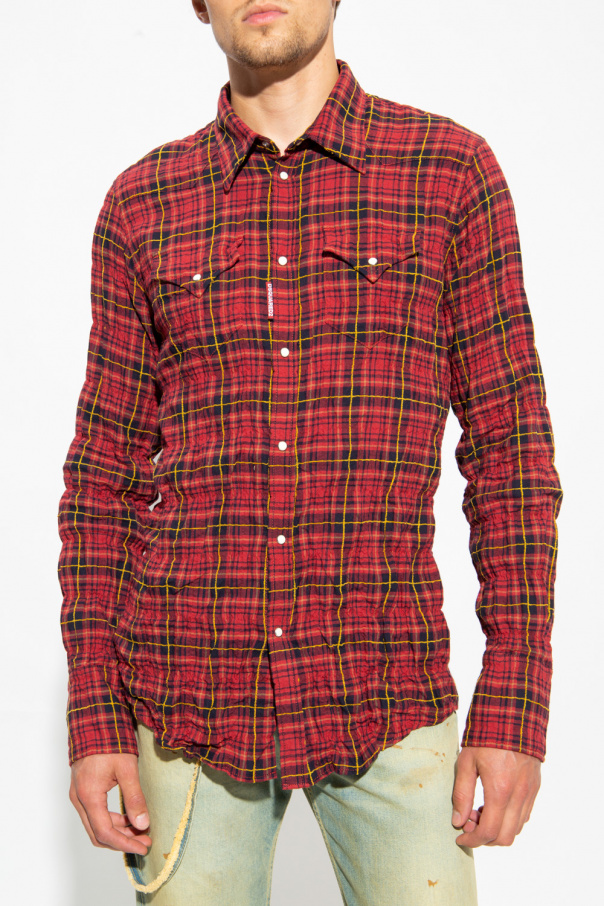 Red shirt from Dsquared2. Crafted from creased cotton, this style showcases a black and yellow check pattern. It is complete with front snap closures, two snap-fastened flapped pockets on the front, a logo tag sewn on the side and long sleeves with snap-fastened cuffs.