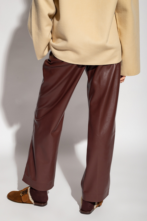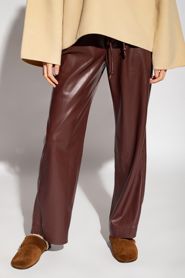 Brown ‘Calie’ loose-fitting trousers from Nanushka. Crafted from the brand’s signature OKOBOR™ vegan leather, this pair features an elastic drawstring waistband and three slip pockets. OKOBOR™ is exclusive to Nanushka. Their new alternative to leather has 100% recycled backing and a more responsible composition.