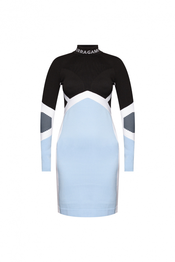 Black, white and blue ribbed dress from Salvatore Ferragamo. Decorated with a logo pattern, this design is complete with stitching details and ribbed trims at the collar, hem and cuffs.