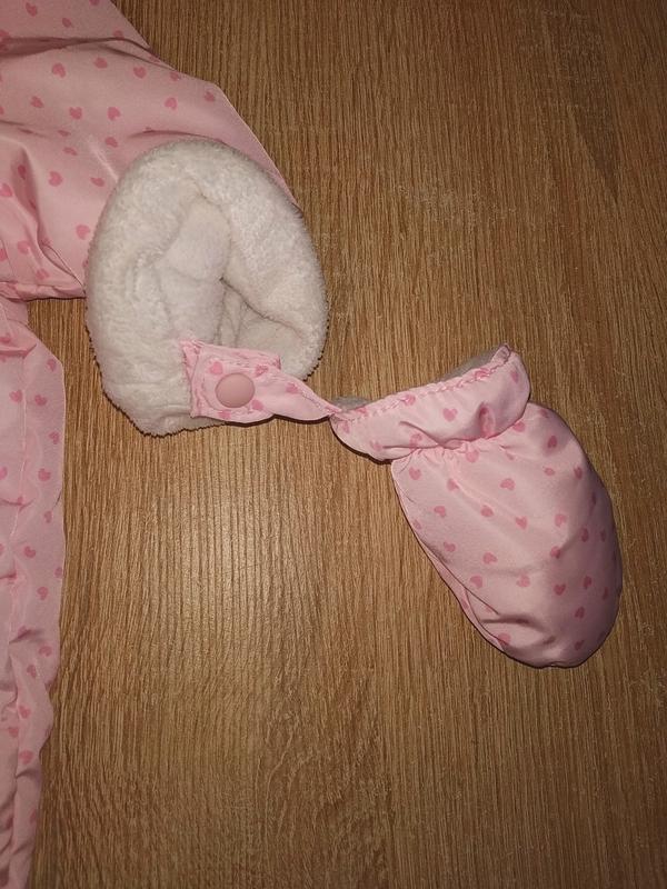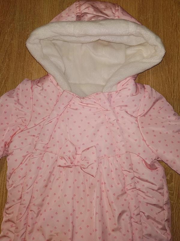 Утеплений демісезонний чоловічок для дівчинки. Верх плащівка, утеплювач синтепон, підкладка капюшона дрібна травичка, підкладка чоловічка - фліс. Стан верху ідеальне, всередині фліс трохи подсобрался від прань, зовсім небагато.. Склад: 100 % поліестер. Чоловічок підходить від 0 до 3-4 місяців. Довжина від плеча до п'яти 50 см, довжина від горловини по середині до памперса 32 см, плечі 19 см, рукав 19 см, ширина між пахвами 26 см, ширина по стегнах 29 см, глибина капюшона 16 див.