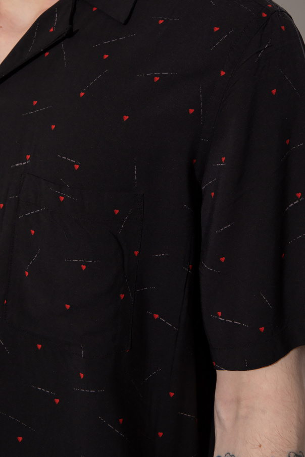 Black ‘Morse’ shirt with short sleeves from AllSaints. Fastened with buttons, this short sleeve design features a heart pattern in red and grey.
