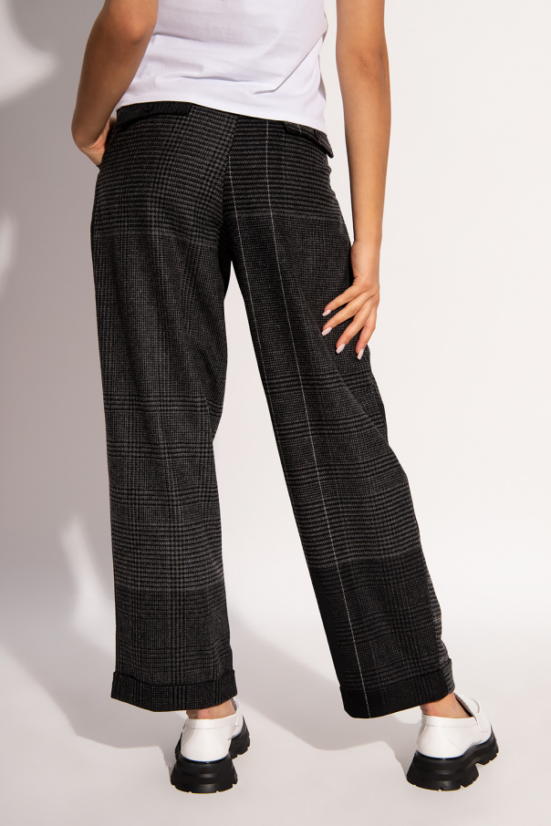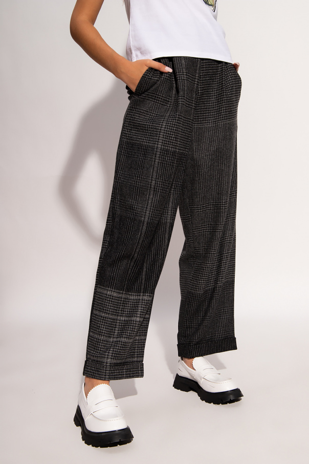 Black, grey and white trousers from In Dust by MCQ, the ‘No. 8’ collection. Made of wool, this pair features a zip fly and button closure, check pattern, light blue logo patch at the back, two slip pockets, two buttoned flap pockets and wide, slightly tapered legs with turn-up cuffs.