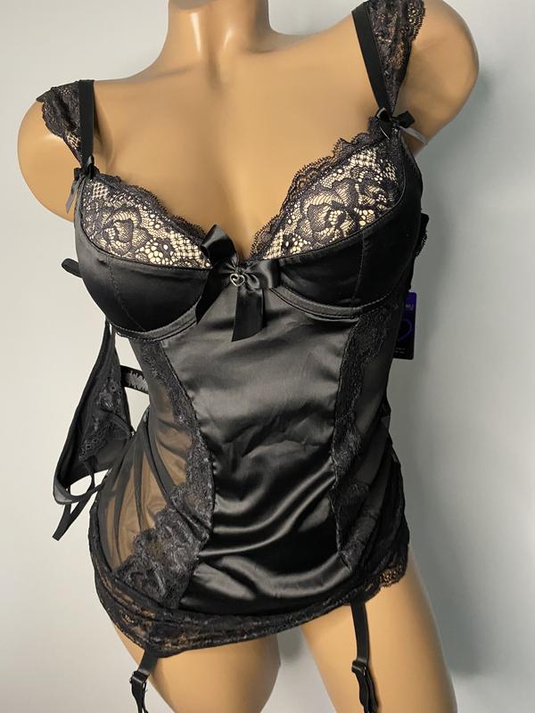 чашечка 75А, талия в спокойном состоянии 60 см, тянется до 70 см, бедра в спокойном состоянии 80 см, тянется до 92 см. Длина от середины груди до низа 42 см. Трусики пояс 66 см, тянется до 80 см.