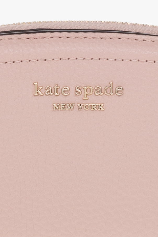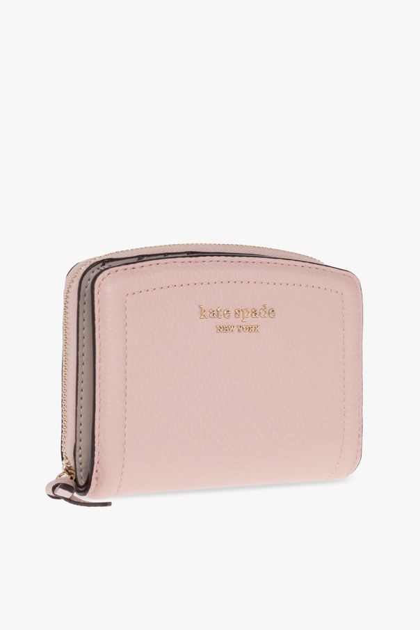Light pink wallet from Kate Spade. Crafted from grained leather, this design fastens with a snap and showcases a metal logo plaque on the front, one slip pocket and one zip coin pocket at the back, gold-tone metal hardware and one bill compartment, four slip pockets and six card slots inside.