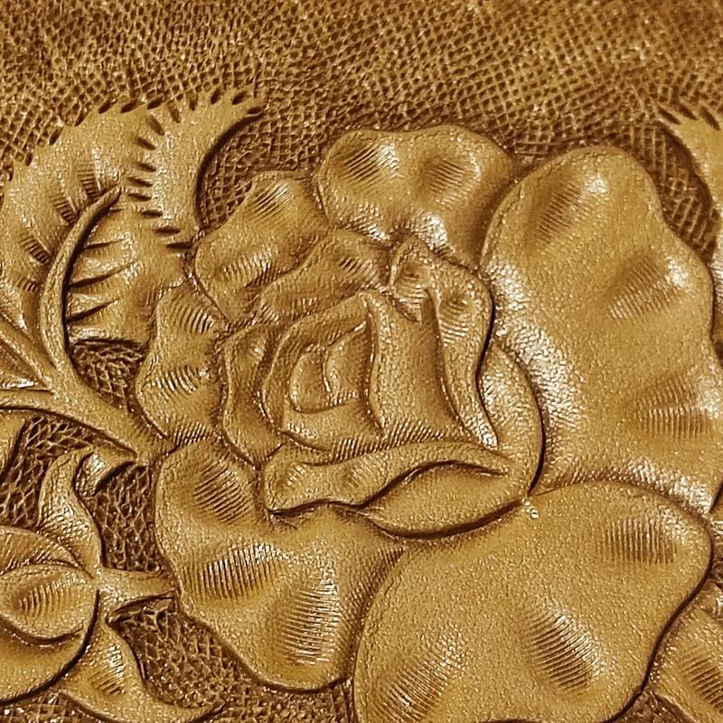 Кожаный кошелек клатч ручной работы с цветочным дизайном. Симпатичный и универсальный кошелек в стиле клатч. Внешний материал представляет собой тисненую кожу теплого бежевого цвета с красивой патиной и штриховкой, украшенной прекрасным цветком розы, Край оформлен темно-коричневой кружевной окантовкой. Внутри одно отделение. Застегивается на кнопки с обеих сторон. Размеры - 21,5 х 13 см. Материал - 100% кожа.