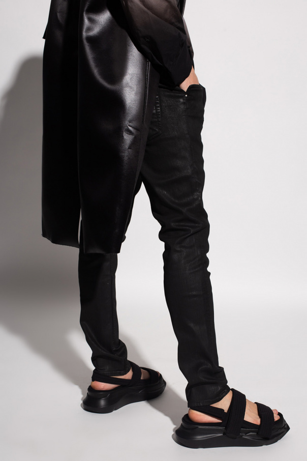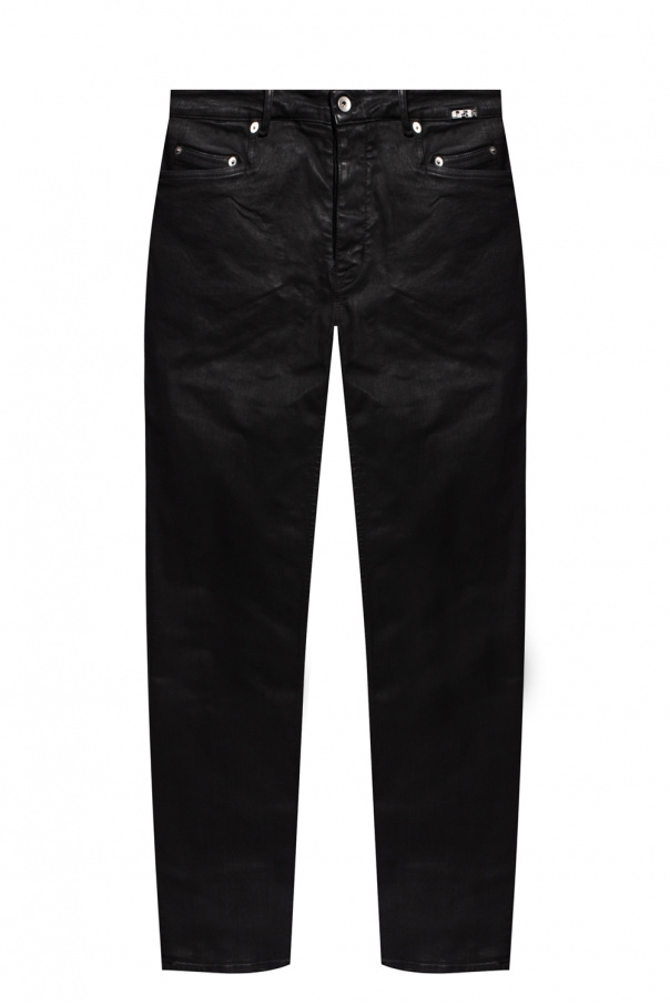 Black trousers from Rick Owens DRKSHDW. Fastened with buttons, this tapered leg design features a patch, strap with a logo, two slip pockets, three front pockets and two back pockets.