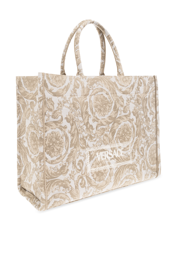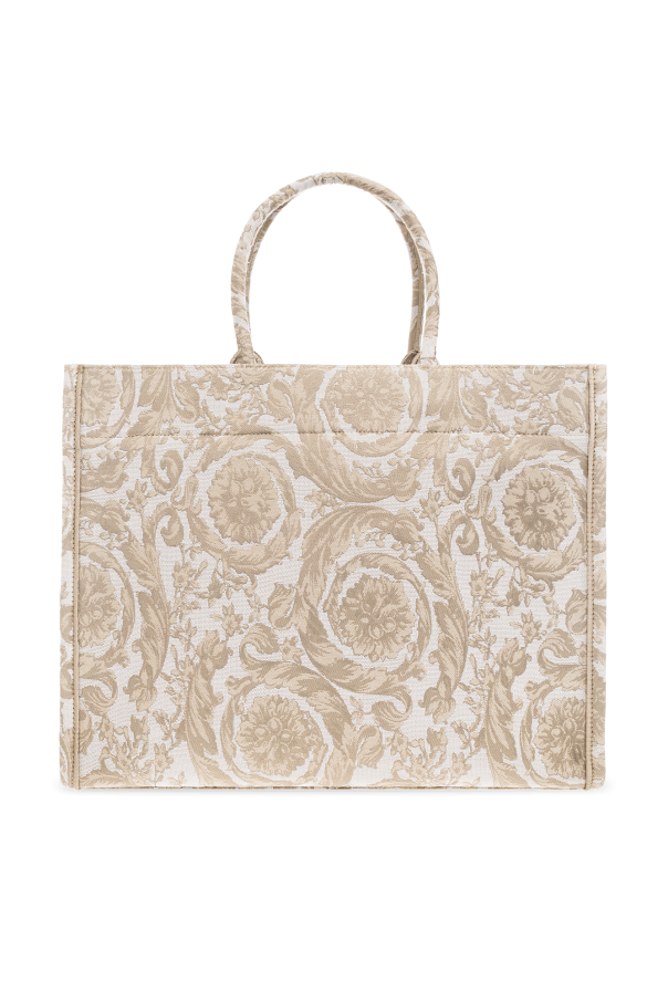 Beige and white ‘Athena Large’ shopper bag from Versace. Made of fabric with a jacquard Barocco pattern and calf leather trims, this design features a logo embroidery, two half-round handles, gold-tone metal hardware and one internal compartment with one zip pocket.