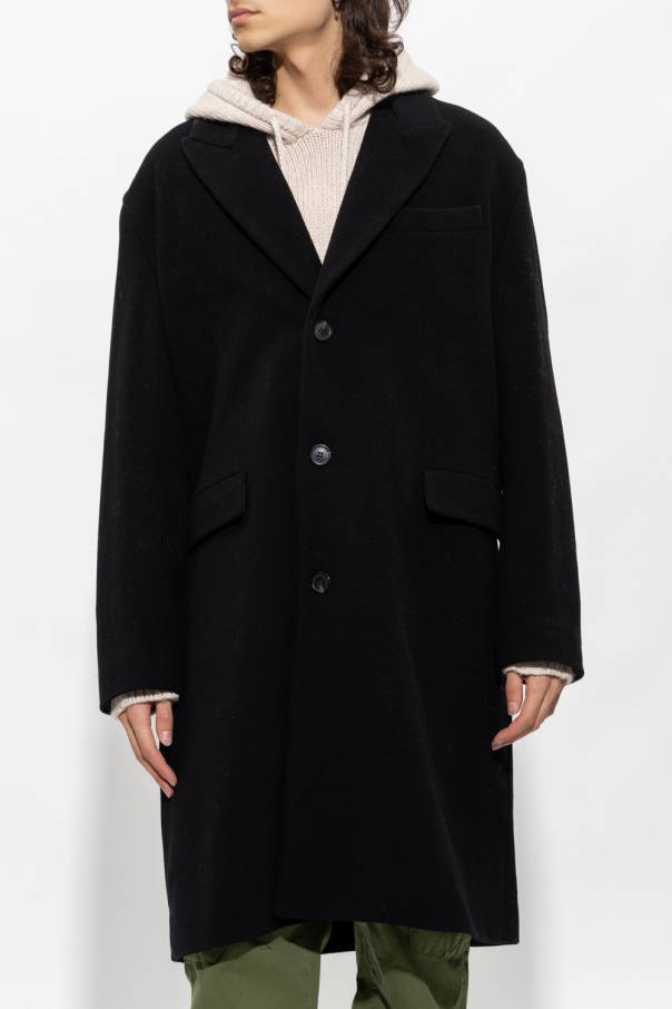 Black ‘Woaoa’ coat from A.P.C. Crafted from a wool and cashmere blend, this style features button fastenings, peak lapels, one slip pocket, two flapped pockets, long sleeves and a single back vent.